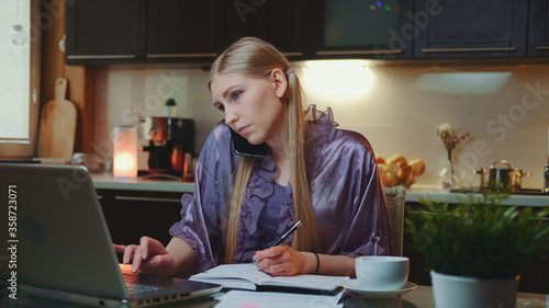 Young business woman working at home by sitting at the computer and speaking by smartphone. She is in home bathrobe in the kitchen.
