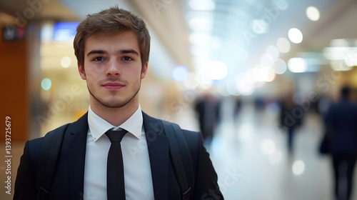 Young businessman exudes confidence in a bustling airport, embodying determination and focus.