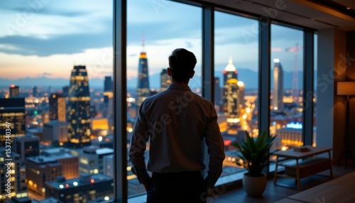 Young Businessman Standing in Modern Office Overlooking Cityscape at Dusk Professional Environment Ambition