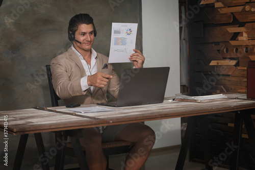 Young businessman uses online video conference to work from home during coronavirus covid 19 outbreak as a new normal lifestyle for self quarantine