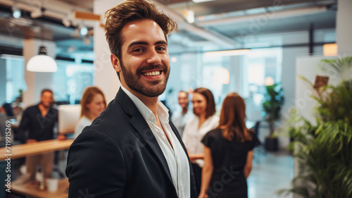 man, young, businessman, suit, white, group, business, office, male, happy, success, successful, cheerful, happiness, positive, smile, face, expression, adult, 1, people, person, portrait, smiling, colleague, business partner, crowd, man, caucasian, modern, light, interior, many