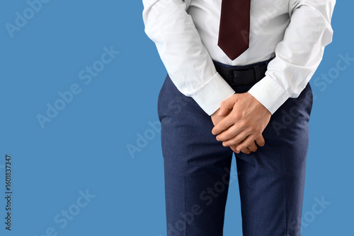 Young businessman with prostate problem on blue background, closeup. Cancer awareness concept