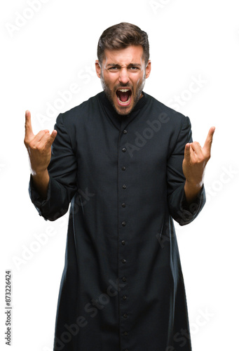 Young catholic christian priest man over isolated background shouting with crazy expression doing rock symbol with hands up. Music star. Heavy concept.