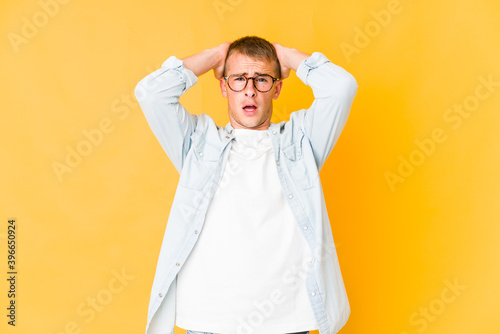 Young caucasian handsome man screaming with rage.