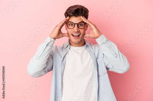 Young caucasian man isolated on pink background receiving a pleasant surprise, excited and raising hands.