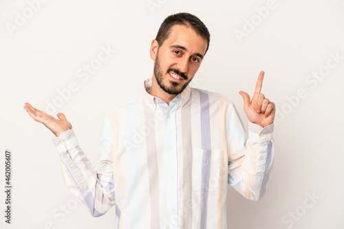 Young caucasian man isolated on white background holding and showing a product on hand.