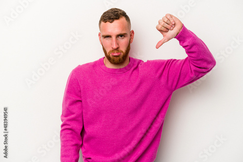 Young caucasian man isolated on white background showing thumb down and expressing dislike.