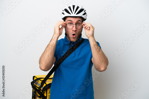 Young caucasian man with thermal backpack isolated on white background with glasses and surprised