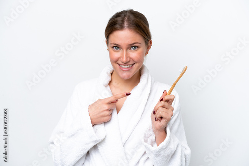Young caucasian woman brushing teeth isolated on white background with surprise facial expression