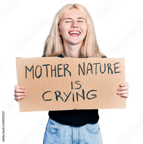 Young caucasian woman holding mother nature is crying protest cardboard banner smiling and laughing hard out loud because funny crazy joke.