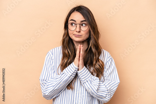 Young caucasian woman isolated on beige background praying, showing devotion, religious person looking for divine inspiration.