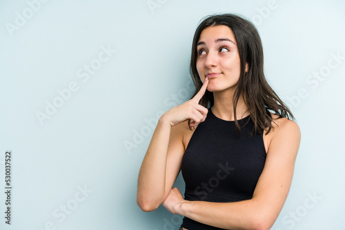 Young caucasian woman isolated on blue background looking sideways with doubtful and skeptical expression.
