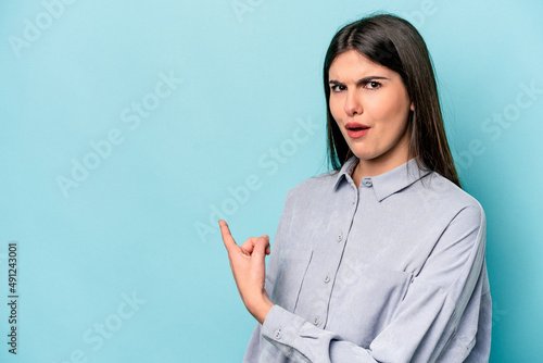 Young caucasian woman isolated on blue background smiling and pointing aside, showing something at blank space.