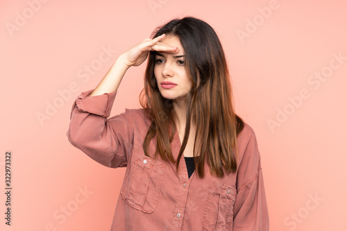 Young caucasian woman isolated on pink background looking far away with hand to look something