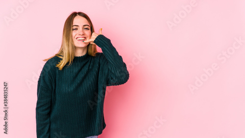 Young caucasian woman isolated on pink background showing a mobile phone call gesture with fingers.