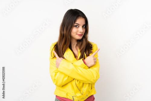 Young caucasian woman isolated on white background pointing to the laterals having doubts