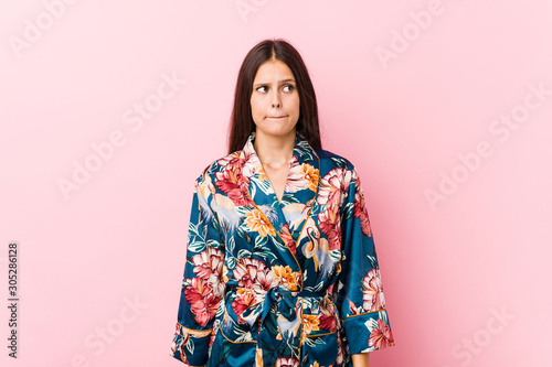 Young caucasian woman wearing a kimono pajama confused, feels doubtful and unsure.