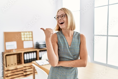 Young caucasian woman working at the office wearing glasses smiling with happy face looking and pointing to the side with thumb up.