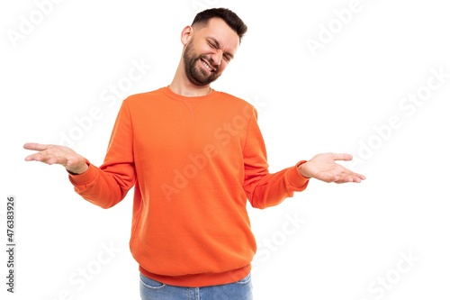 young charismatic man in an orange jumper on a white background throws up his hands annoyed and to the sides