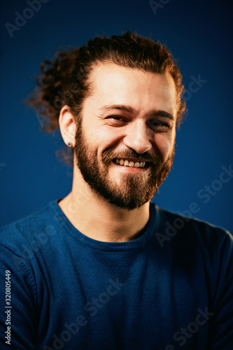 Young charming attractive Caucasian bearded hipster with curly hair dressed in sweater standing in front of blue background and looking at camera.