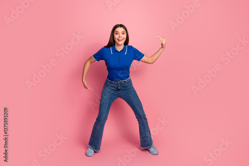 female, woman, girl, young, student, latin, hispanic, casual attire, glamour, style, fashion, model, beautiful, attractive, lovely, charming, happy, funny, brunette, hair, polo, trendy, leisure, lifestyle, pink, background, youth, youngster, advertising, shopping, promoting, gesture, smile, positive, expressive, posing, enthusiastic, hand, high-coloured, energetic, chic, fresh, playful, portrait, t-shirt, adorable, dancing, disco, party