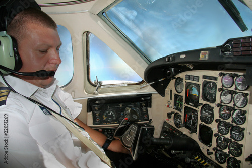 Young corporate pilot in cockpit in flight