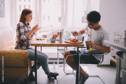 couple, breakfast, home, hot drink, eating, morning, young, kitchen, family, woman, together, man, food, 2, beautiful, people, talking, eat, concept, table, drink, adult, indoor, girlfriend, boyfriend, love, female, healthy, fun, person, caucasian, asian, male, vegetable, oil, enjoy, enjoying, spending, time, partnership, start, day, moment, background, window, window, couch, chair
