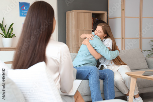 Young couple hugging on sofa at sexologist's office