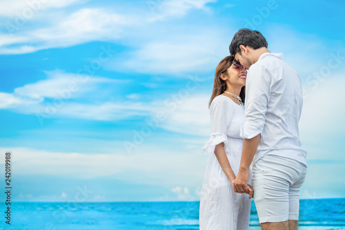 Young couple in love looking to each other and holding hand together at sea beach on blue sky .happy smiling young wedding with white dress kissing Romantic moment head to head or face to face