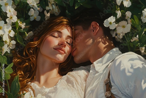 Young couple rests peacefully among abundant white blossoms and lush green foliage