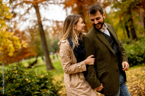 Young couple walking in the autumn park