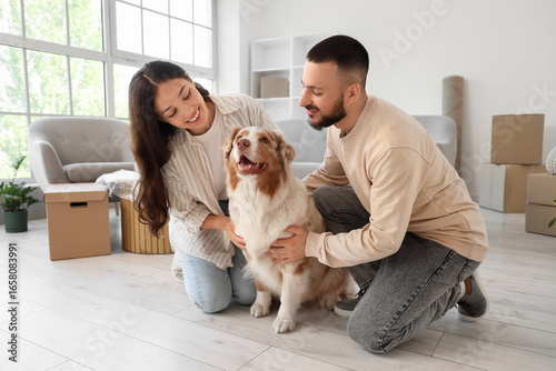 Young couple with Australian Shepherd dog in room on moving day