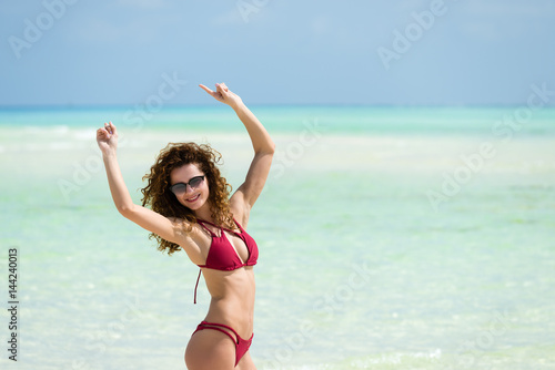 Young curly hair girl posing in bikini on the tropical beach.Copy space