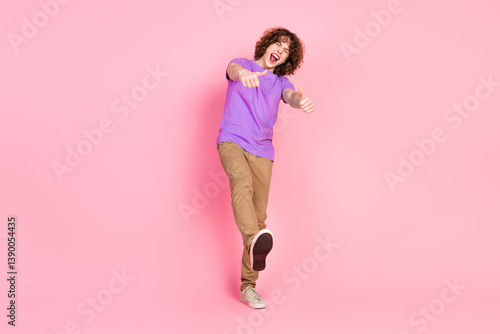 signs, showing, thumb, up, like, young, man, male, guy, student, youth, youngster, brown, curly, hair, purple, shirt, casual attire, style, fashion, model, stylish, trendy, photogenic, funny, leisure, pink, advertising, shopping, promoting, gesture, posing, dance, kick, energetic, active, joy, happy, expression, fun, laugh, playful, colourful, movement, vibrant, pose, t-shirt, smile, joyful, outfit