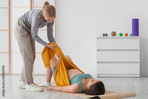 Young doula massaging pregnant woman's belly with scarf on yoga mat at home