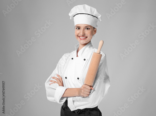 Young female chef with rolling pin on light background