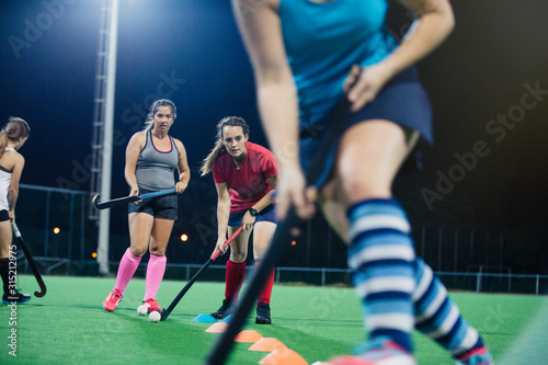 young, woman, field, hockey, player, practice, sport, drill, adult, agile, athlete, ball, candid, caucasian, clothes, colours, competition, competitive, cone, dedication, determination, down, dripped, effort, exercise, generation, healthy, image, lifestyle, look, muscular, night, outdoors, people, play, recreation, selective focus, racked, stick, strength, team, three, tilt, togetherness, train, vitality, work