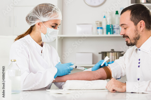 woman, nurse, syringe, injection, man, visitor, patient, client, clinic, hospital, medicals, men at work, physician, practitioner, employee, medicine, job, professional, room, indoor, effectiveness, female, male, guy, girl, adult, young, caucasian, european, white, people, 2, expert, mask, glove, protection, hygiene, solution, communication, health, diagnostic, diagnosis, care, attention, assistance