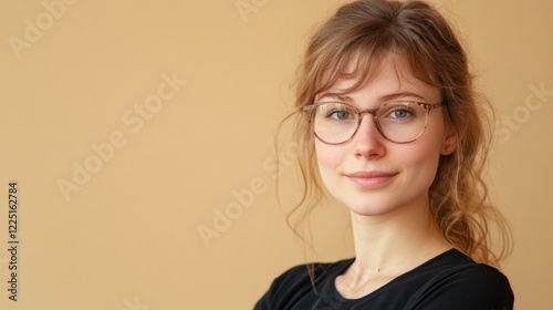 Young female teacher with glasses smiling confidently on beige backdrop with space for text, showcasing professionalism and positivity.