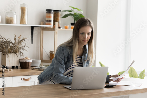 Young focused woman stands in home kitchen, do accounting work, hold paper document, check household bills, pay utility use modern bank application on laptop, busy in paperwork, comparing information