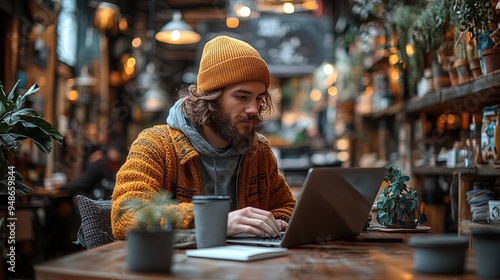 freelancer, laptop, cafes, working, entrepreneur, small business, technology, wireless, cyberspace, cafes, hipster, modern, young adult, man, beard, casual attire, concentrated, sharpened, productivity, business, communication, online, cosy, warm, atmosphere, urban, lifestyle, hot drink, drink, table
