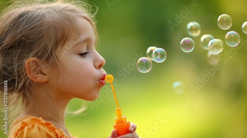 young, girl, blow, soap, bubble, blower, outdoors, green, background, copy, space, childlike, innocence, charme, closeup, portrait, sunny, day, yellow, sunlight, natural, lighting, joyful, atmosphere, air, shallow, depth, field