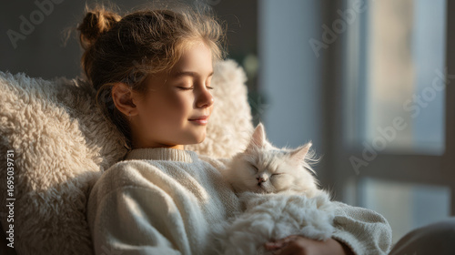 young, girl, birthplace, beloved, cat, lap, softly, singing, peaceful, lullaby, they, relax, together, nestled, cosy, armchair, sunlit, window, warm, natural, light, flood, room, gentle, expression, face, reflect, pure, joy, contentment, creating, heartwarming, atmosphere, comfortably, resonate, soothing, melody, adding, tranquil, vibe, scene, background