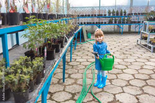 Young girl watering plants in greenhouse