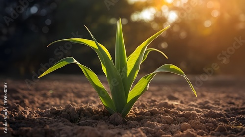 Young Green Plant Sprouting Up from the Soil at Sunset