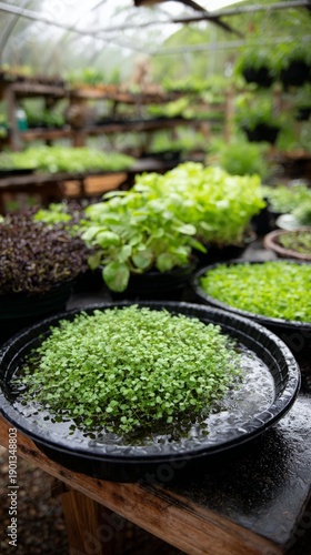green, sprout, growing, water, wooden, table, inside, greenhouse, plant, horticulture, agriculture, growth, nature, fresh, young, organic, botany, garden, herb, vegetable, farming, tray, container, overhead, natural, lighting, moisture, seed, cultivation, germination, life, environment, dirtied, leaf, vibrant, lush