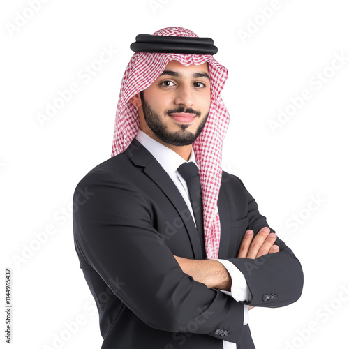 arab, businessman, saudi, middle east, islamic, muslim, portrait, success, confidence, leadership, professional, executive, suit, attaching, keffiyeh, white background, isolated, studio shot, arms crossed, smiling, happy, young adult, male, one person, business, finance, industry, international, global, culture, ethnicity, diversity, representation