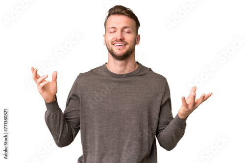 Young handsome caucasian man over isolated chroma key background smiling a lot