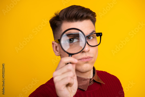 magnifier, man, male, young, guy, photogenic, casual attire, student, fashion, trendy, hair, model, retro, gentleman, background, style, advertising, funny, lifestyle, yellow, attractive, promoting, vintage, leisure, jumper, sweater, happy, shopping, gesture, hand, magnifying, glasses, sharpened, face, expression, look, portrait, thinking, insight, creative, education, work, detail, alert, professional, serious, goggles, business, businessman, academic
