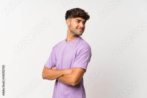 man, man, people, person, male, guy, photogenic, young, caucasian, slim, hispanic, isolated, background, wall, white, casual attire, looking, forward, smiling, smile, portrait, happy, happiness, face, look, back, view, arm, crossed